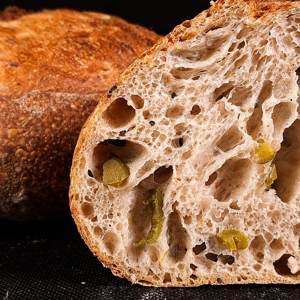 Chleb pszenny na zakwasie żytnim z wyraźnym dodatkiem jalapeño i aromatycznej czarnuszki. Klasyczny chleb koszykowy po długiej, chłodnej fermentacji, chrupiąca skórka, sprężysty miękisz i lekko lekko pikantny smak z nutą ziołowo orzechową.